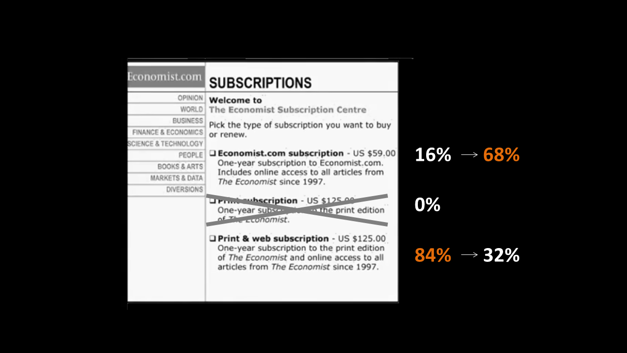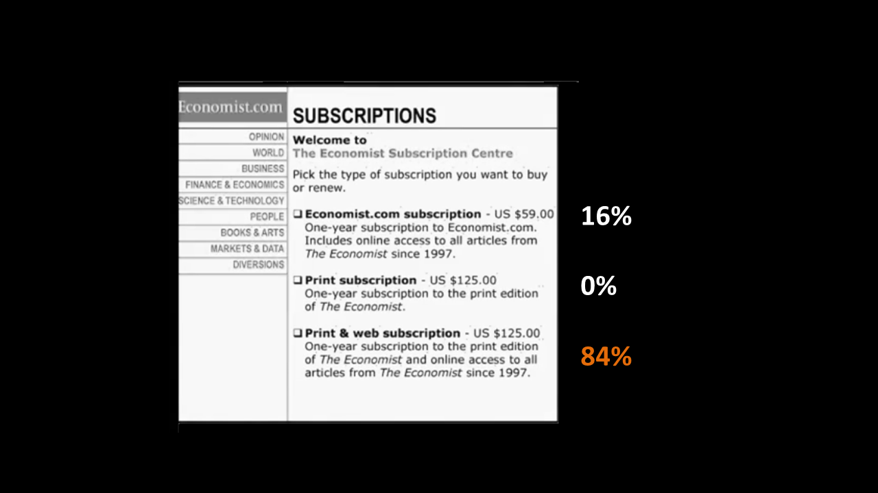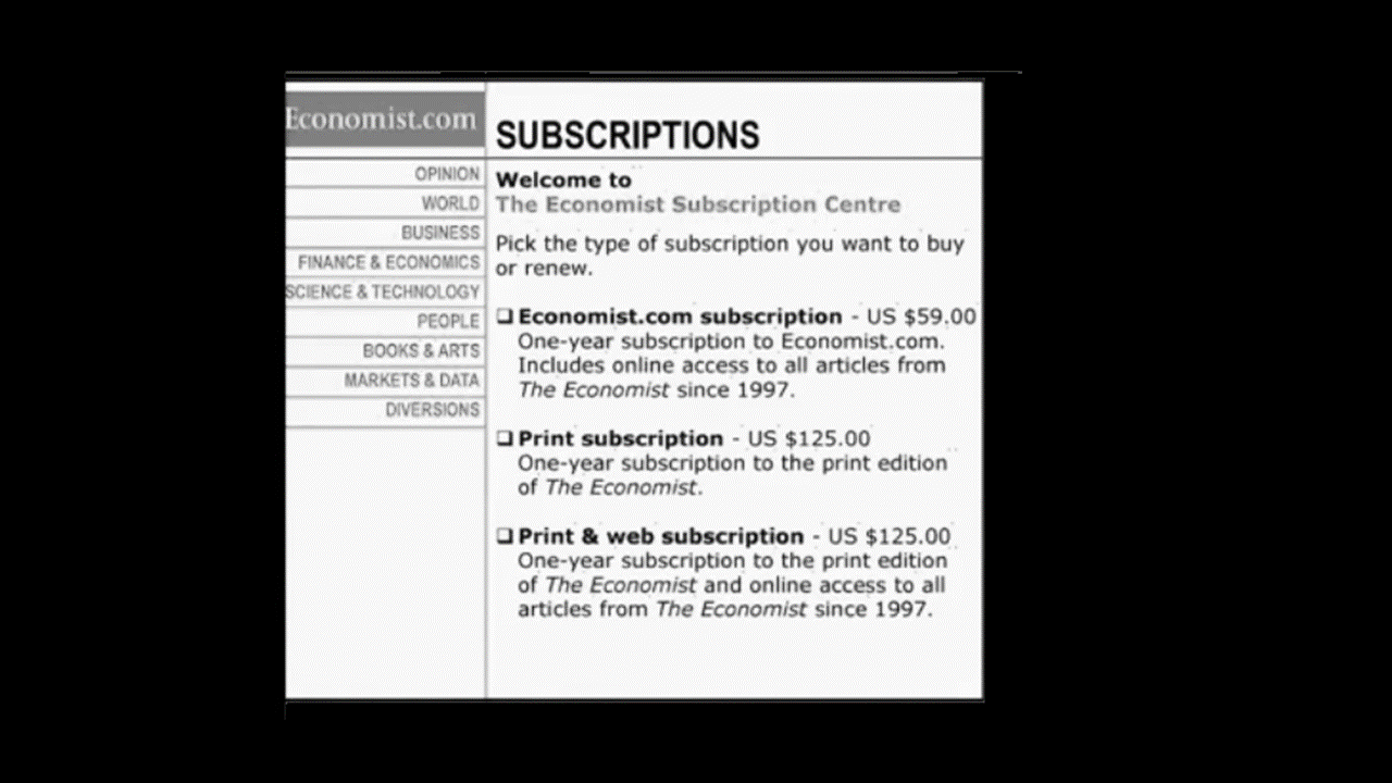 Der Psychologe und Verhaltensökonom Dan Ariely hat diese Frage – bzw. eine sehr ähnliche – seinen Studierenden gestellt. Ausgangspunkt war das Abomodell des Economist, das auf dessen Internetseiten gezeigt worden ist. Es gibt hier drei Optionen: Die Online-Ausgabe für 59 Dollar, die gedruckte Ausgabe für 125 Dollar oder ein Paket mit beiden Ausgaben für 125 Dollar.
