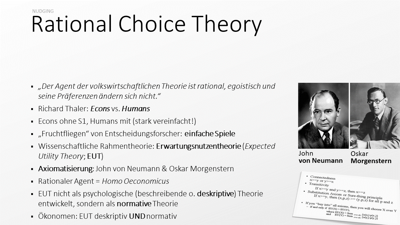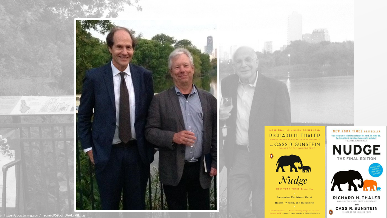 Versuchen wir zuerst mal, die Stränge, zu identifizieren, die zum Phänomen Nudging beigetragen haben. Die Autoren – Richard Thaler, ein Wirtschaftswissenschaftler, und Cass Sunstein, ein Rechtswissenschaftler – haben ihr Buch Nudge in einem wissenschaftlichen Kontext geschrieben. Diesen Kontext kennen wir schon. Er wurde geprägt durch die Forschung im Bereich Heuristics & Biases von Daniel Kahneman und Amos Tversky. Diese Forschung wiederum war eine psychologisch fundierte Antwort auf das wirtschaftswissenschaftliche Modell eines rationalen Entscheiders; eines Homo Oeconomicus.