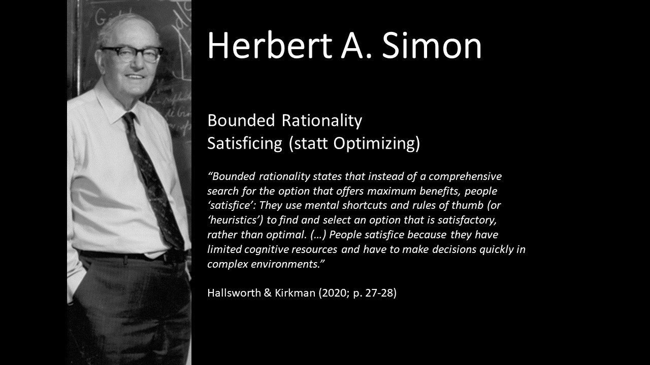 Diese begrenzte Rationalität (Bounded Rationality) hat auch schon Herbert Simon zum Gegenstand seiner Forschung gemacht14. Folge dieser begrenzten Rationalität ist unsere Tendenz, in Entscheidungssituationen nicht die optimale Option zu finden, sondern unter den Beschränkungen unserer Kognition eine zufriedenstellend Wahl zu treffen. Simon hat für dieses Verhalten den Begriff Satisficing geprägt.