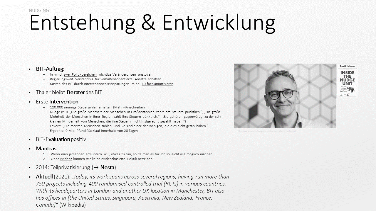 Als die Tories 2010 an die Regierung kommen, wird ein kleines Team von sieben Personen ins Leben gerufen, das sich dieser Inhalte annehmen soll: das Behavioural Insights Team – kurz BIT (das meist aber nur als Nudge-Unit bezeichnet wird). Der Leiter ist David Halpern.