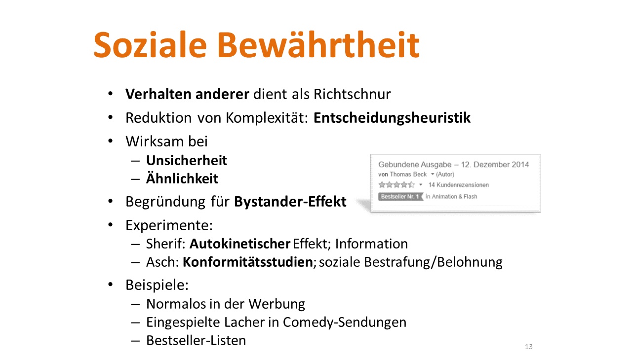 Wir Menschen sind soziale Wesen. Deshalb ist das Verhalten unserer Artgenossen eine Richtschnur, um unser eigenes Verhalten zu gestalten oder zu bewerten. Wir tun tendenziell das, was auch andere tun. Das ist soziale Bewährtheit. Auch hier geht es im Grunde wieder um Verringerung von Anstrengung und Komplexität. Wenn ich das tue, was andere tun, muss ich mein eigenes Verhalten nicht aufwändig ableiten und planen. In diesem Sinn ist die soziale Bewährtheit wieder eine Entscheidungsheuristik, eine Daumenregel, die wir zur Steigerung unserer Verhaltenseffizienz einsetzen.