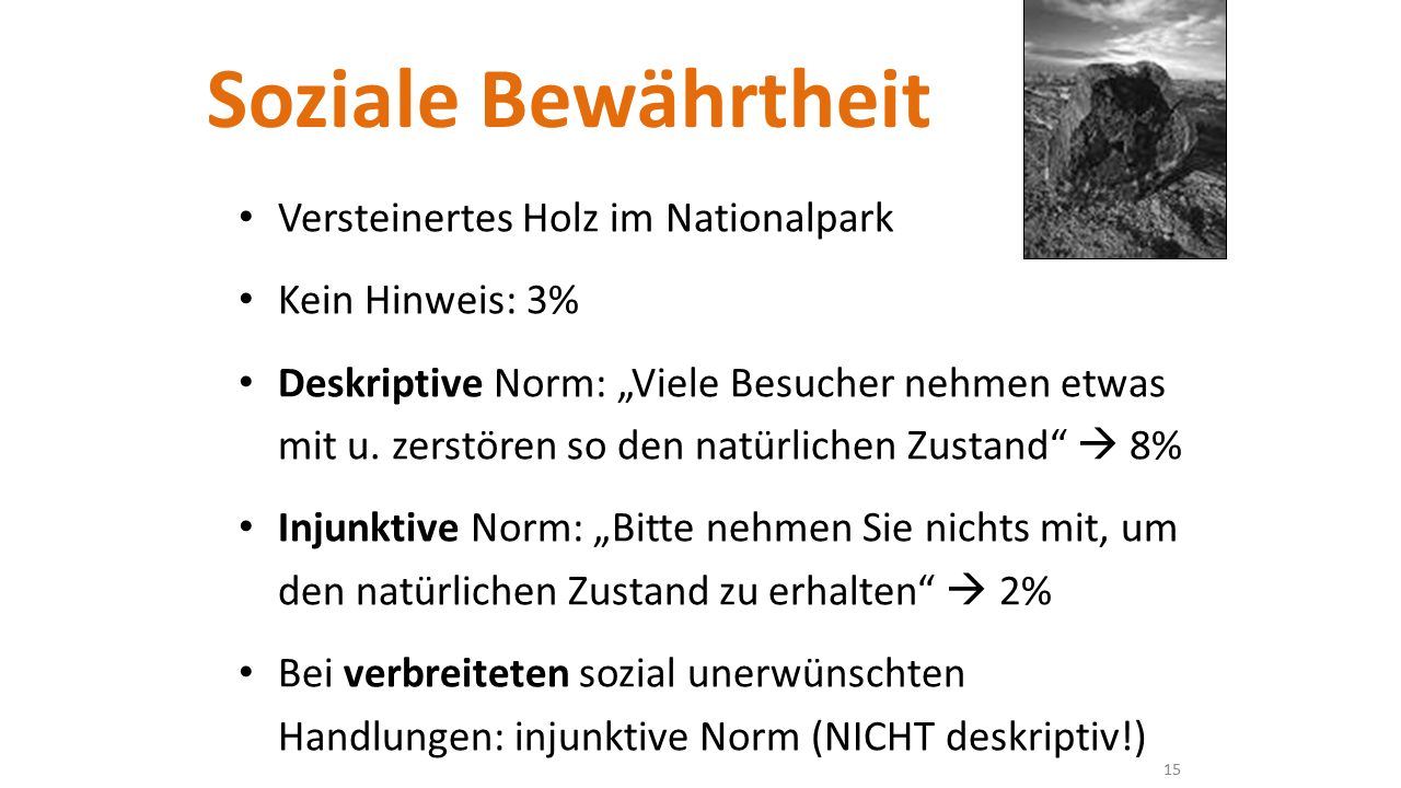 Warum? Durch diese Aussage wird es normal, das versteinerte Holz mitzunehmen. Die Aussage wird eher nicht als Verbot aufgefasst, sondern als Freibrief, da ja viele andere auch so handeln. Wird die Aussage zu einer injunktiven Norm umformuliert – “Bitte nehmen Sie nichts mit, um den natürlichen Zustand des Parks zu erhalten” – funktioniert der Hinweis besser. Jetzt verringern sich die ursprünglichen 3 auf 2%.
