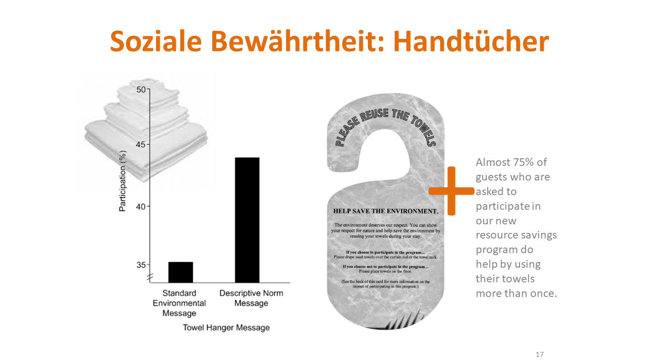 Ein weiteres Beispiel: Wenn Sie schon mal in einem Hotel genächtigt haben, kennen Sie den Badezimmer-Code: Handtücher auf dem Boden sollen bitte durch neue ersetzt werden. Handtücher über der Stange werden weiter verwendet. Dem Hotelpersonal ist die zweite Variante natürlich lieber: weniger Aufwand und dadurch weniger Kosten. Wenn die Gäste dazu bewegt werden könnten, ihre Handtücher länger zu verwenden, wäre das daher ein durchaus geldwerter Fortschritt.