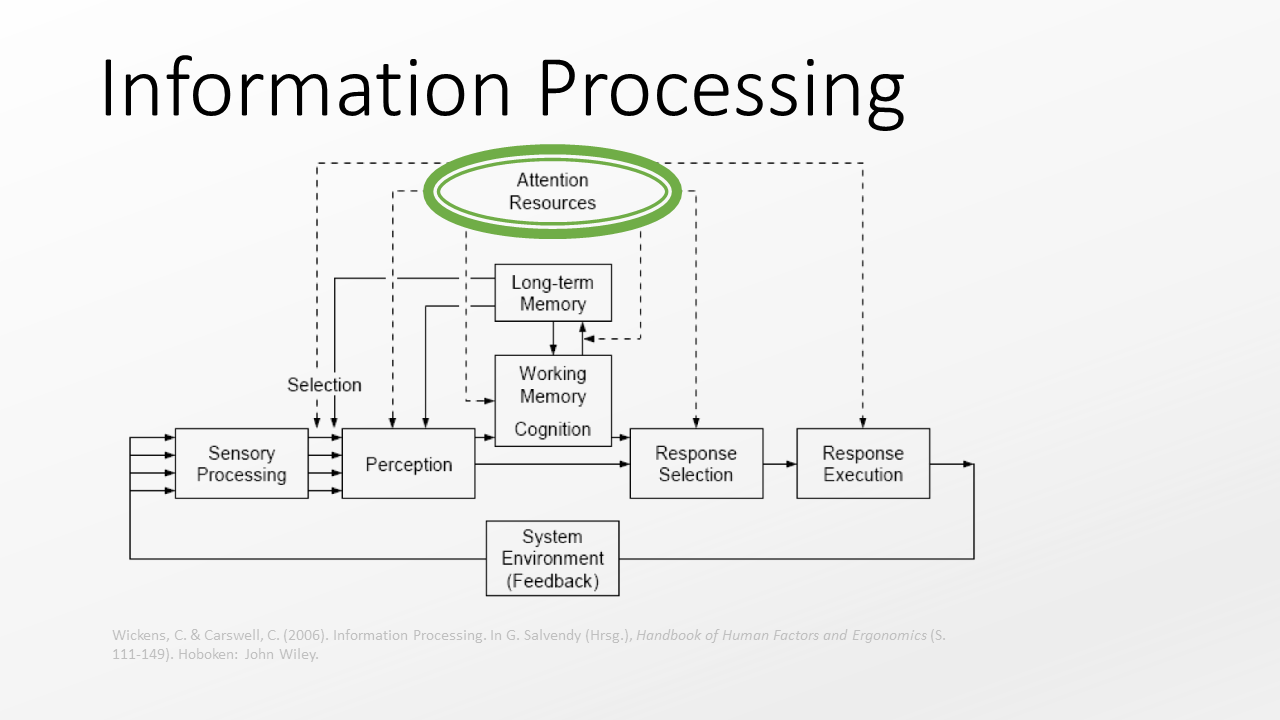 Das Mehrfachressourcenmodell von Wickens (2020) beschreibt eine begrenzte Anzahl an Ressourcen und ihre Verarbeitung, was viele experimentelle Befunde zu Interferenzeffekten in Multitasking-Aufgaben erklären kann. Nach Wickens ist das Mehrfachressourcenmodell ein “model of time-sharing or multitask divided attention performance” (Wickens et al., 2008, S. 242). Wickens stellt den Bezug zu unserem Modell der Informationsverarbeitung her. Dabei sieht er die Aufmerksamkeit als Kleber, “that binds together all the various components of cognition and human information processing” (Wickens et al., 2008, S. 242).
