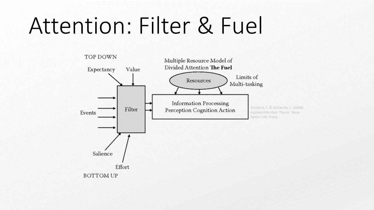 Die Darstellung auf der Folie liefert keinen wirklich neuen Beitrag zu unserem Wissen. Wir sehen auch hier das Informationsverarbeitungsmodell. Die zweiteilige Rolle der Aufmerksamkeit wird hier aber deutlich herausgestellt: Filter und Ressourcen (= Fuel).