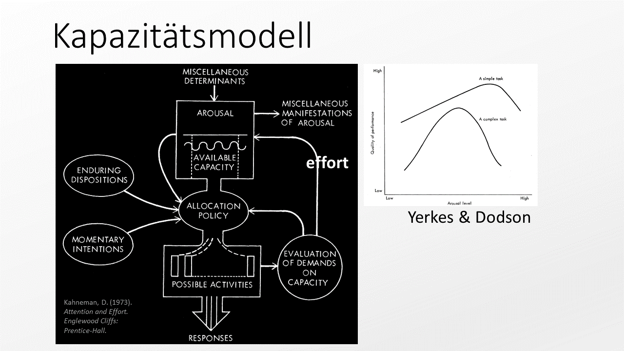 Das bekannteste dieser Modelle ist auf der Folie dargestellt. Es stammt von Kahneman (1973). Kahneman argumentiert, dass dem kognitiven System ein einheitliches Reservoir begrenzter Kapazität zur Verfügung steht, um die Aufgabenausführung zu unterstützen. Schwierige Aufgaben erfordern eine große Menge dieser Ressource, was zu Problemen führt, wenn gleichzeitig andere Prozesse darauf zugreifen müssen. Einfache, hoch geübte oder automatisierte Aufgaben erfordern wenige Ressourcen und können leichter gleichzeitig ausgeführt werden. Im Gegensatz zu sog. Einkanal-Theorien kann dieses Modell die Parallelisierung, also die erfolgreiche gleichzeitige Ausführung mehrerer Tätigkeiten, erklären. Die allgemeine Gesamtmenge an Ressourcen ist variabel und abhängig vom individuellen Erregungslevel (das erinnert uns an das Modell von Yerkes & Dodson). Die tatsächlich einsetzbare Menge an Ressourcen wird von überdauernden individuellen Eigenschaften und den unmittelbaren Absichten beeinflusst, die die Zuweisungsstrategie bestimmen. Für schwierige Aufgaben kann das Erregungsniveau adaptiv gesteigert und so die verfügbare Menge an Ressourcen erhöht werden.