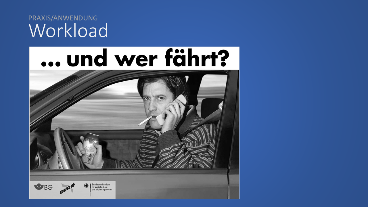Workload ist immer dann relevant, wenn unsere Informationsverarbeitungskapazitäten an ihre Grenzen kommen. Das ist beispielsweise regelmäßig der Fall, wenn wir versuchen, mehrere Dinge gleichzeitig zu tun; beispielsweise beim Autofahren. Hier neigen wir dazu, dass wir uns nebenbei vielleicht etwas zu intensiv mit dem Navi, dem Radio oder gar dem Smartphone – also einer Sekundär- oder Tertiäraufgabe – beschäftigen, während wir unsere Ressourcen eigentlich auf die primäre Fahraufgabe konzentrieren sollten. Der Ausgangspunkt unserer Überlegungen ist ein vermuteter Zusammenhang zwischen Workload und Leistung (s. o.): Wenn die Workload zu hoch wird, nimmt die Leistung ab.