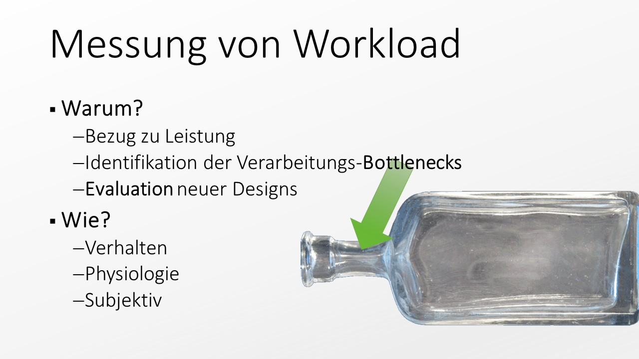 In solchen Situationen werden unsere Informationsverarbeitungskapazitäten überbeansprucht. Wie wir wissen, sind diese Kapazitäten begrenzt. Es ist der Zweck von Workloadmessung, diese Kapazitäts-Bottlenecks, die während der Interaktion auftreten, zu identifizieren.