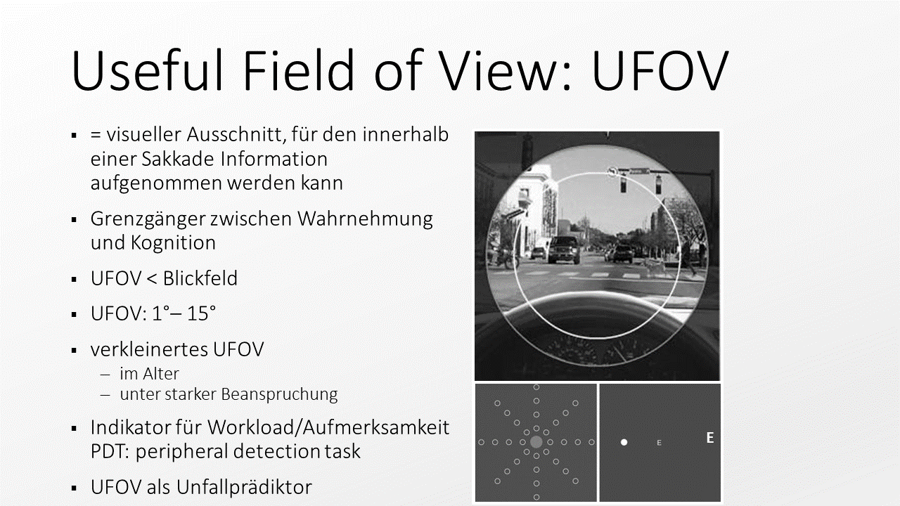 Von besonderem Interesse im Zusammenhang mit der Messung von mentaler Beanspruchung ist das sog. Useful Field of View, abgekürzt als UFOV. Das UFOV ist der Ausschnitt des Sehfelds, in dem innerhalb einer Fixation visuelle Information aufgenommen werden kann. Das UFOV ist damit ein kleinerer Teilbereich des Sehfeldes. Interessant ist dabei, dass sich das UFOV dynamisch mit der Beanspruchung durch die Situation ändert. Typische Werte liegen dabei im Bereich von 1° bis 15°. Je beanspruchter wir in einer Situation sind, desto kleiner wird unser UFOV; wir sind dann sprichwörtlich im Tunnel.
