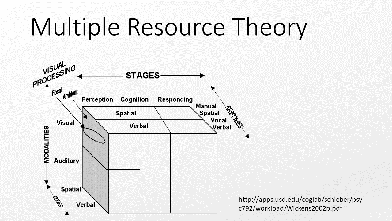 Er charakterisiert den Verarbeitungsprozess anhand der Stufen eines vereinfachten Informationsverarbeitungsmodells (Wahrnehmung, zentrale Verarbeitung, Handlungsausführung), Modalität (visuell, akustisch), Codierung (verbal, räumlich) und visueller Kanal (fokal, peripher). Gleichzeitig ausgeführte Aufgaben beeinflussen sich danach umso mehr, je größer ihre Übereinstimmung in diesen Attributen ist.