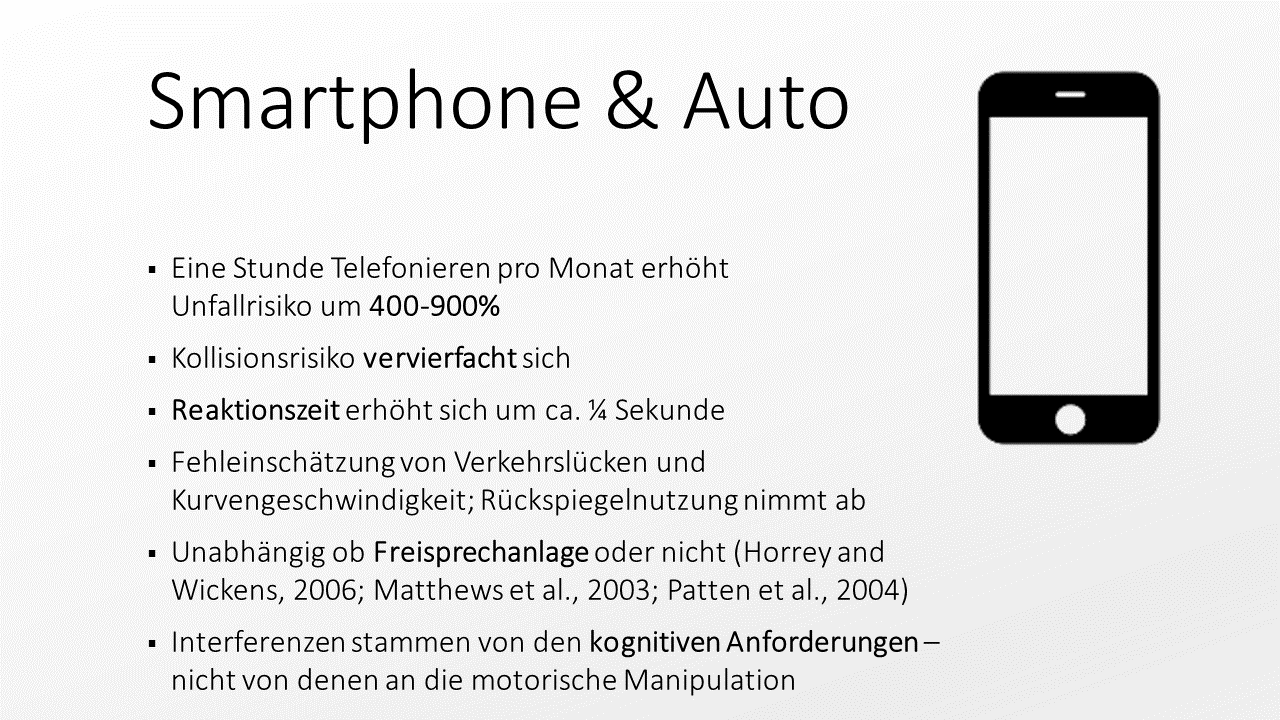 Meist geht es dabei um Distracted Driving – also die Ablenkung unserer Aufmerksamkeit von der Primäraufgabe durch das Smartphone. Die Situation ist seit langem aus wissenschaftlicher Sicht ziemlich eindeutig: Smartphones während der Fahrt zu bedienen ist eine schlechte Idee. Die Reaktionszeit steigt, die Einschätzung unterschiedlicher Merkmale der Fahrsituation ist falsch und dadurch steigt das Risiko eines Unfalls.