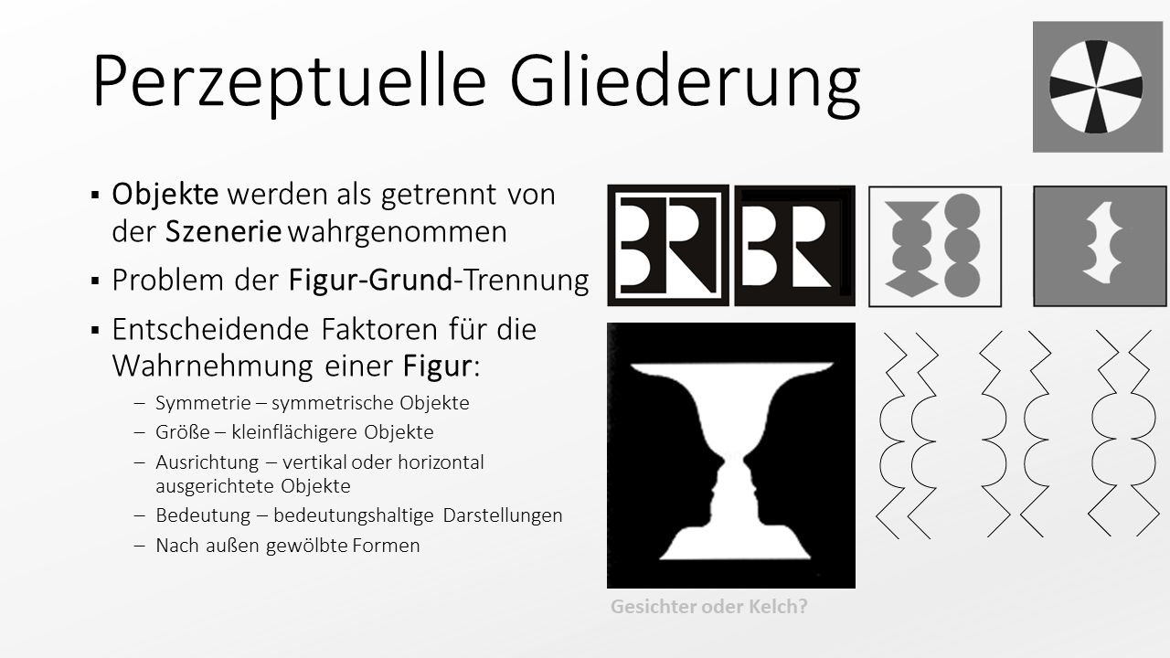 Mit dem Begriff der “perzeptuellen Gliederung” ist die Unterscheidung von Figur und (Hinter-)Grund gemeint. Figuren haben eher Objekt-Charakter als der Grund. Die perzeptuelle Gliederung ist damit zwar ein Prozess, der eher der Mustererkennung als der zweiten Stufe der visuellen Wahrnehmung zuzuordnen ist. Sie bildet aber gleichzeitig die Basis für die Objekterkennung im dritten und letzten Schritt.