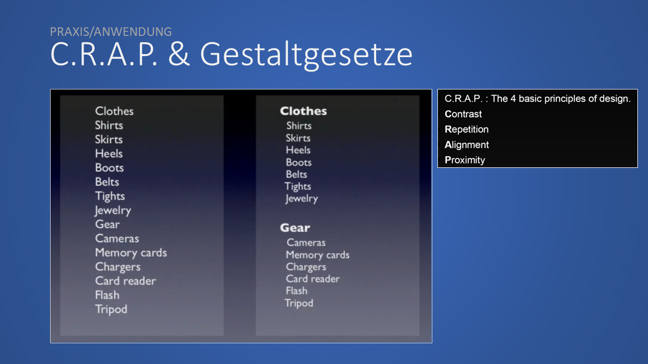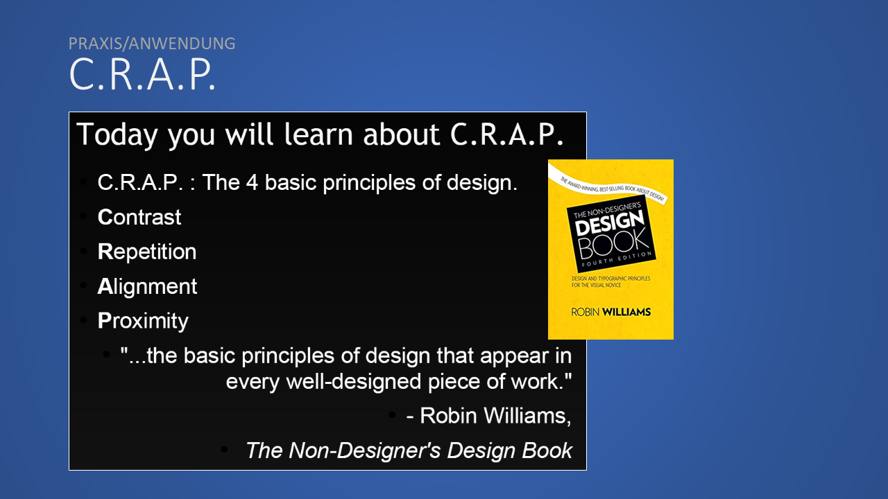 Für uns ist es aber vor allem durch seine inhaltliche Struktur interessant. Es ist in die vier Abschnitte Contrast, Repetition, Alignment, Proximity gegliedert. Williams kürzt das in dem Akronym C.R.A.P. ab.