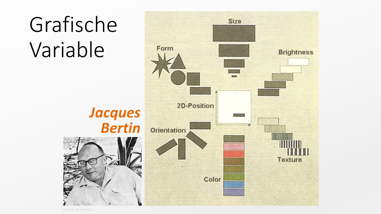 Einen anderen, von der Anwendung her gedachten Zugang zu den oben besprochenen visuellen Merkmalen findet Jacques Bertin. Bertin war ein bekannter Kartograph, der in den 60er Jahren ein Standardwerk zur graphischen Theorie und Visualisierung verfasst hat; die deutsche Übersetzung erschien 1974 (Bertin, 1974).