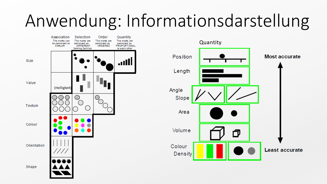 - Quantität: Kann die eine metrische Information durch ein visuelles Merkmal dargestellt werden?