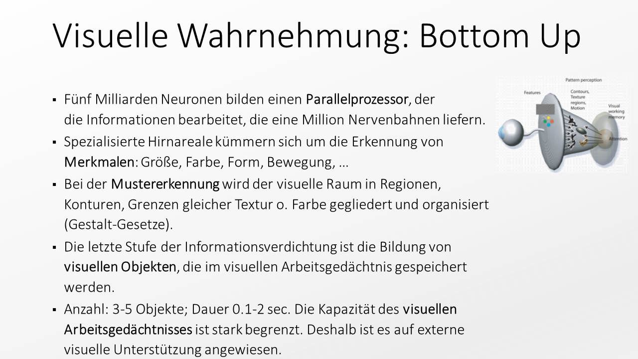 Zusammen mit der vorherigen Folie sollten diese beiden Abbildungen den Weg vom aufgenommenen Reiz (G. T. Fechner nennt das den proximalen Reiz) zur Objektwahrnehmung erläutern.