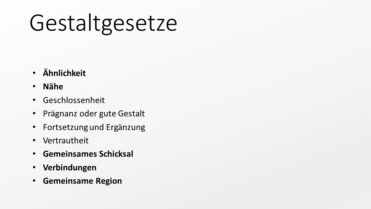 Es gibt noch eine Menge weiterer Gestaltgesetze. Die Folie listet einige davon auf, von denen wir uns aber auf die fett gedruckten beschränken.