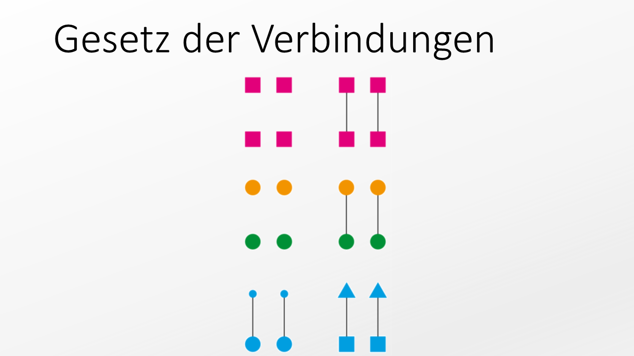 Auch das Gesetz der Verbindungen übt einen sehr starken gruppierenden Einfluss aus. Nehmen wir zuerst jeweils die linke Hälfte der dargestellten Beispiele in den ersten beiden Zeilen. Welche Einflüsse wirken hier gruppierend? Es sind das Gesetz der Nähe und das Gesetz der Ähnlichkeit.