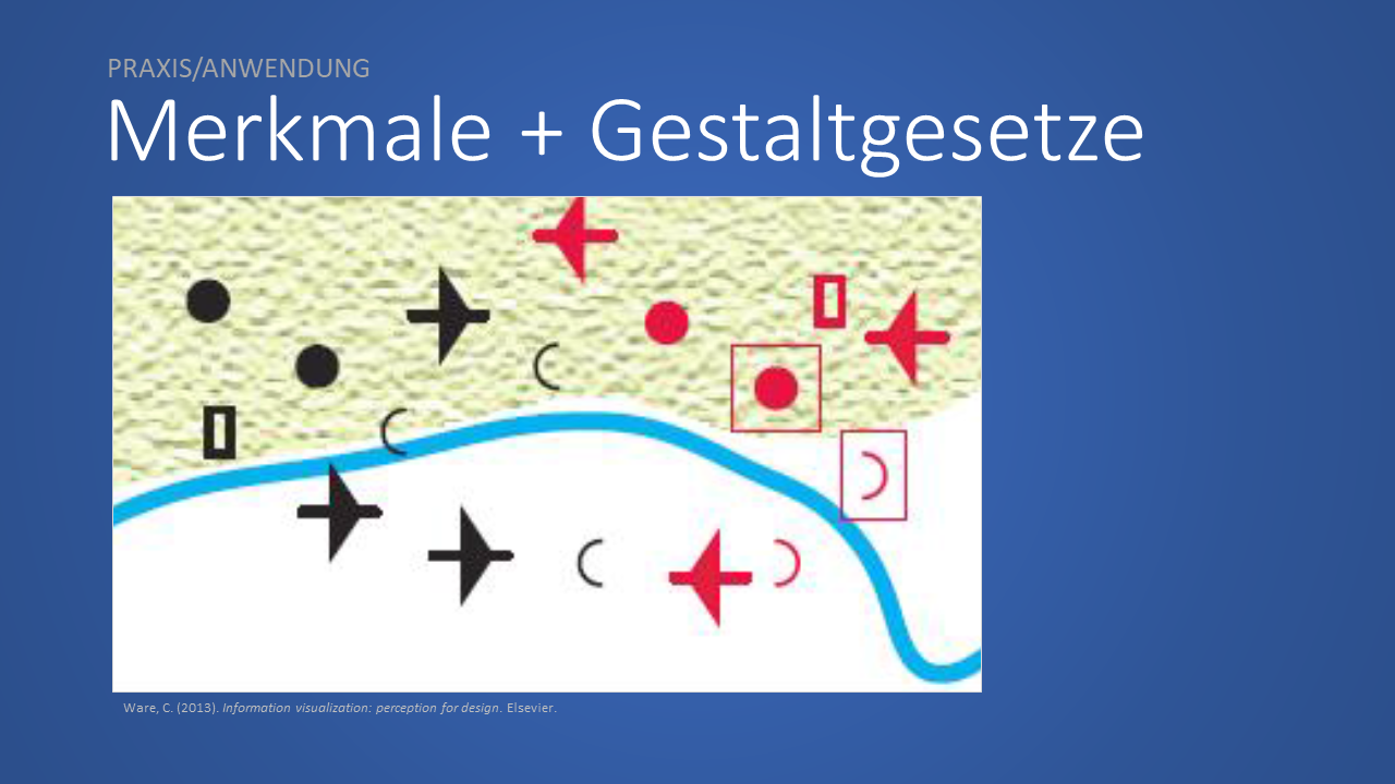 Das Beispiel erinnert nicht ohne Grund an eine Kartendarstellung. Es sind visuelle Elemente und Gestaltgesetze, die bei der Gestaltung von Landkarten eingesetzt werden. Darauf werden wir später noch näher eingehen.