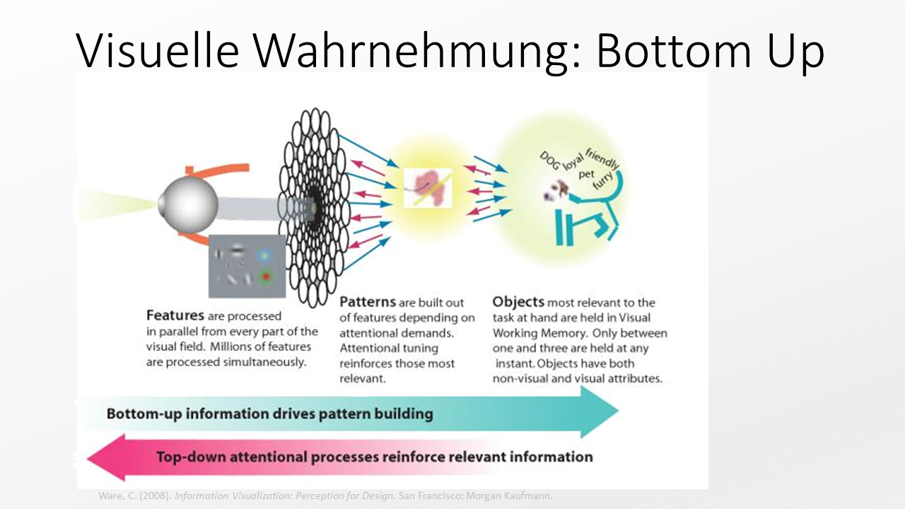 Der Prozess der visuellen Wahrnehmung hat sehr viele Aspekte und Facetten, die wir nicht ansatzweise vollständig besprechen können. Das müssen wir aber auch nicht. Wir orientieren uns dazu an einem Ansatz, den Colin Ware (z. B. Ware, 2021b) gewält hat. Dabei untergliedert er diesen Prozess in zwei grundlegende Perspektiven (bottom-up vs. top-down) und drei Stufen (Merkmale – Muster – Objekte).