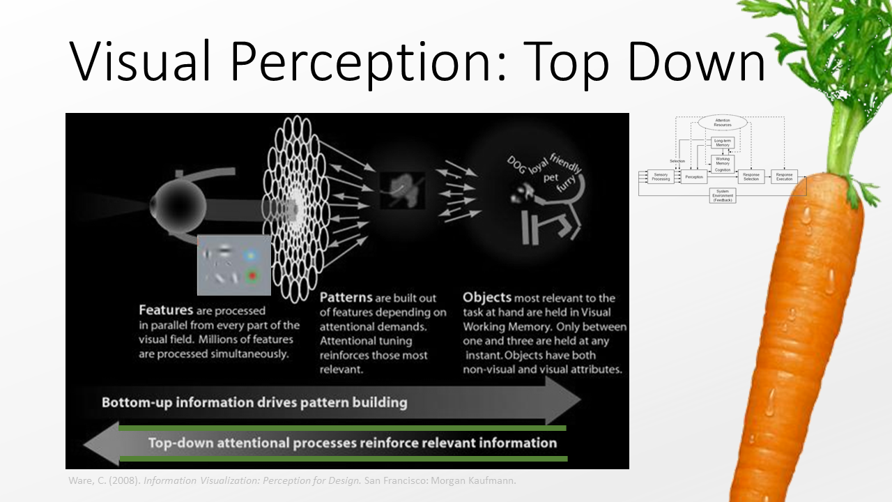 Das erklärt schließlich auch die Karotte auf den beiden letzten Folien: Stellen Sie sich vor, Sie sind im Supermarkt und wollen Karotten kaufen. Also suchen Sie in der Gemüseabteilung nach Karrotten. Ihre Wahrnehmung wird durch diese Aufgabe beeinflusst. Sie verarbeiten bevorzugt Reize, die Sie als orange wahrnehmen und die eine bestimmte Größe und Form haben. Violette Auberginen zum Beispiel passen nicht in dieses Schema. Sie reagieren auf deren Farbe (violett), Form (nach außengewölbt), … weniger sensibel. Auf alles, was in das Merkmalsschema “Karotte” passt, reagieren Sie empfindlicher.
