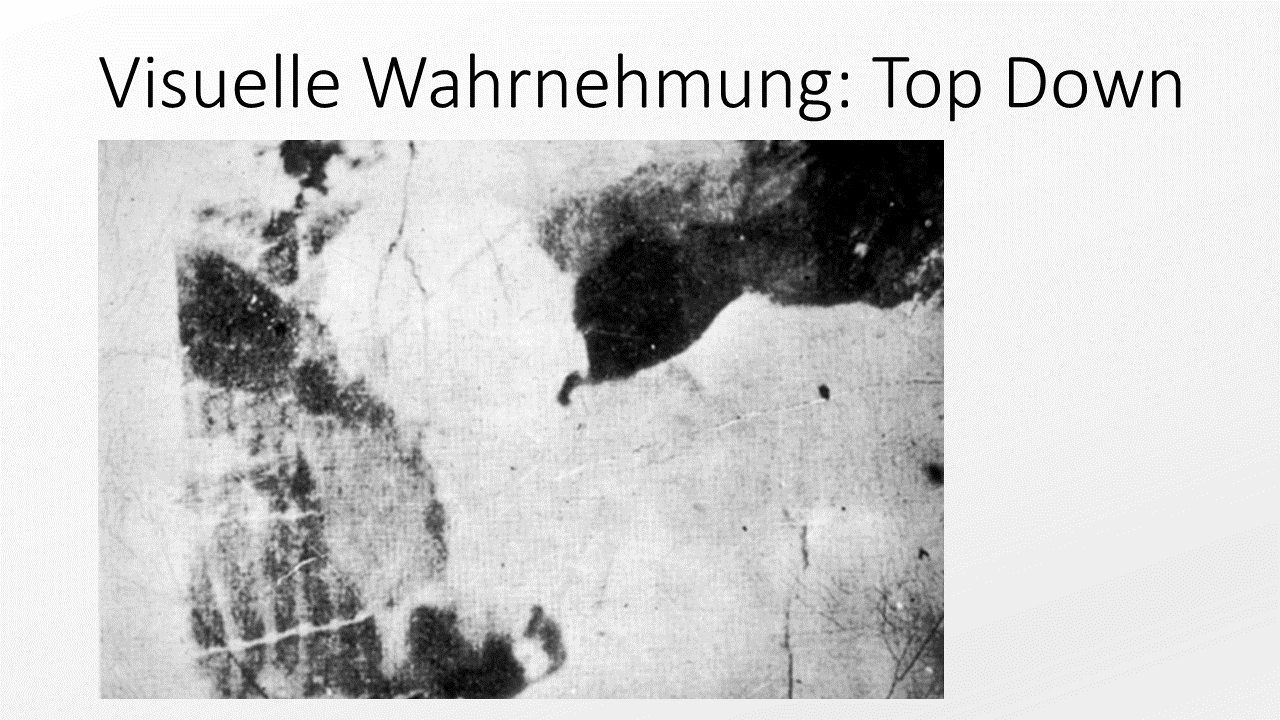 Was ist passiert? Ihre Wahrnehmung bottom-up kam nur bis zur Stufe des Proto-Object-Flux: Regionen und Muster werden arrangiert, um möglichst viel Bedeung zu erhalten. Aber diese Bedeutung stellt sich erstmal nicht ein. Durch die Information “Muh” (top-down) kann nun versucht werden, die Regionen und Muster in das Schema Kuh zu bringen. Was schließlich auch erfolgreich ist. Durch den Top-Down-Einfluss kann der Wahrnehmungsprozess über die zweite Stufe hinaus erfolgreich bis hin zur Objekterkennung ausgedehnt werden.