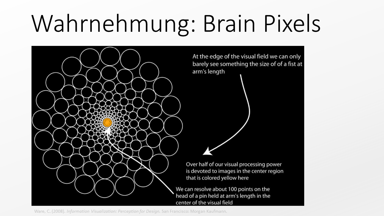 Wenn wir das Konzept der Auflösung nach Pixel beibehalten, können wir unsere visuelle Warhnehmungsleistung mit Hilfe sog. Brain Pixel darstellen. Den Begriff hat Colin Ware geprägt. Wir sehen in der Darstellung, dass die Anzahl dieser Brain Pixel im Zentrum des Sehfelds hoch verdichtet sind, in der Peripherie aber deutlich seltener, dafür größer sind.
