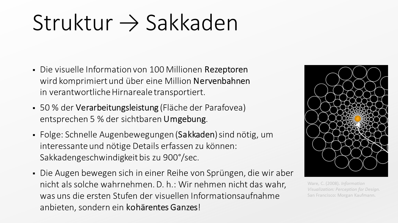 Die schnellen Bewegungen der Augäpfel von Fixation zu Fixation (ca. 900°/s) werden als Sakkaden bezeichnet. Damit haben wir subjektiv den Eindruck, dass wir permanent ein recht exaktes und vor allem kohärentes Bild der Umgebung aufnehmen. Alles was wir betrachten, sehen wir gut – obwohl die zugrundeliegende Sensorik und kortikale Verarbeitungskapazität ungleich verteilt sind. Das gleichen aber die Sakkaden aus.