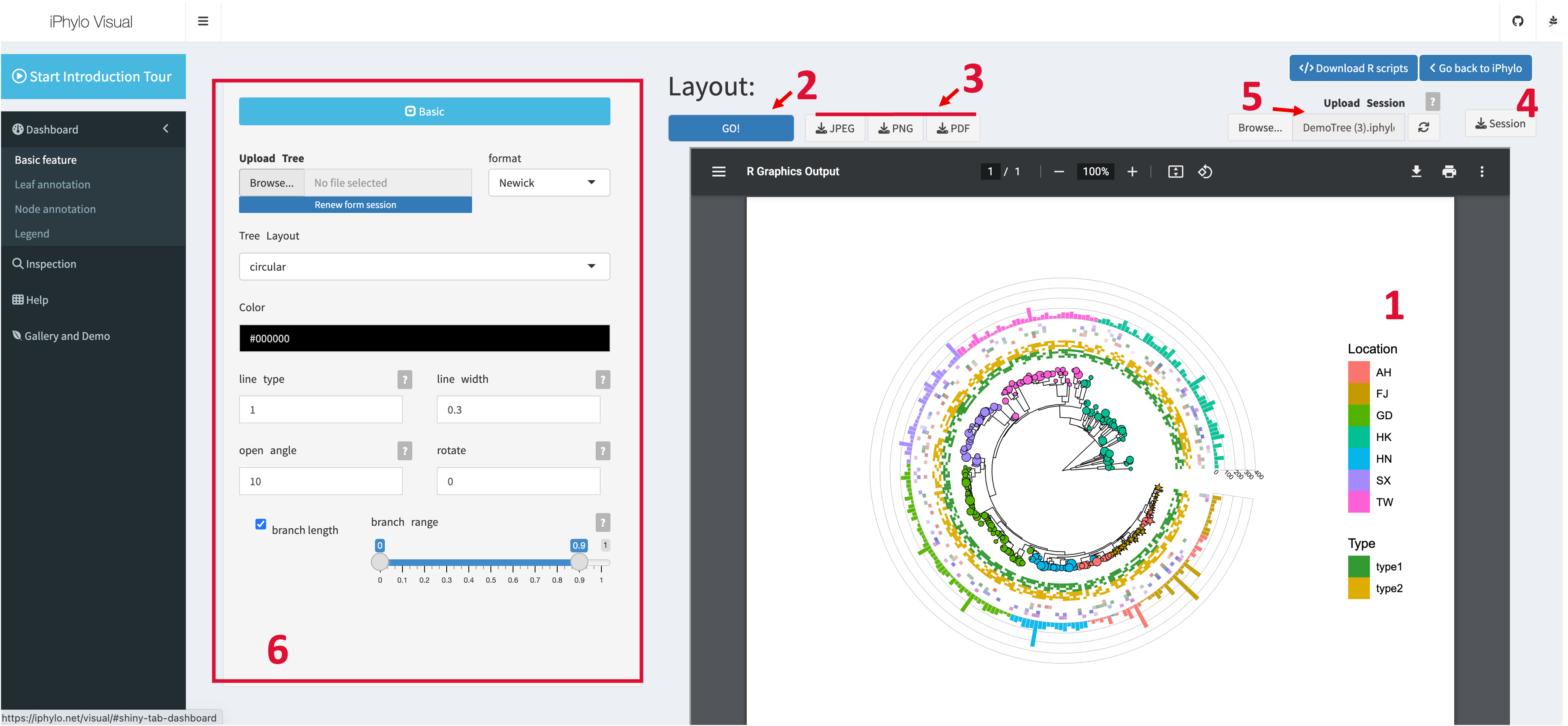 The dashboard page hosts the main annotation and display functions of iPhylo Visual. The user interface consists of several main components: