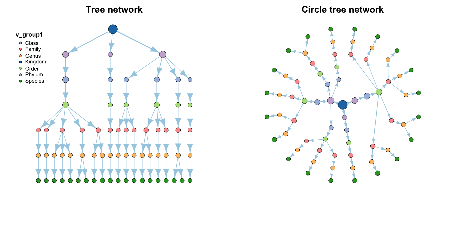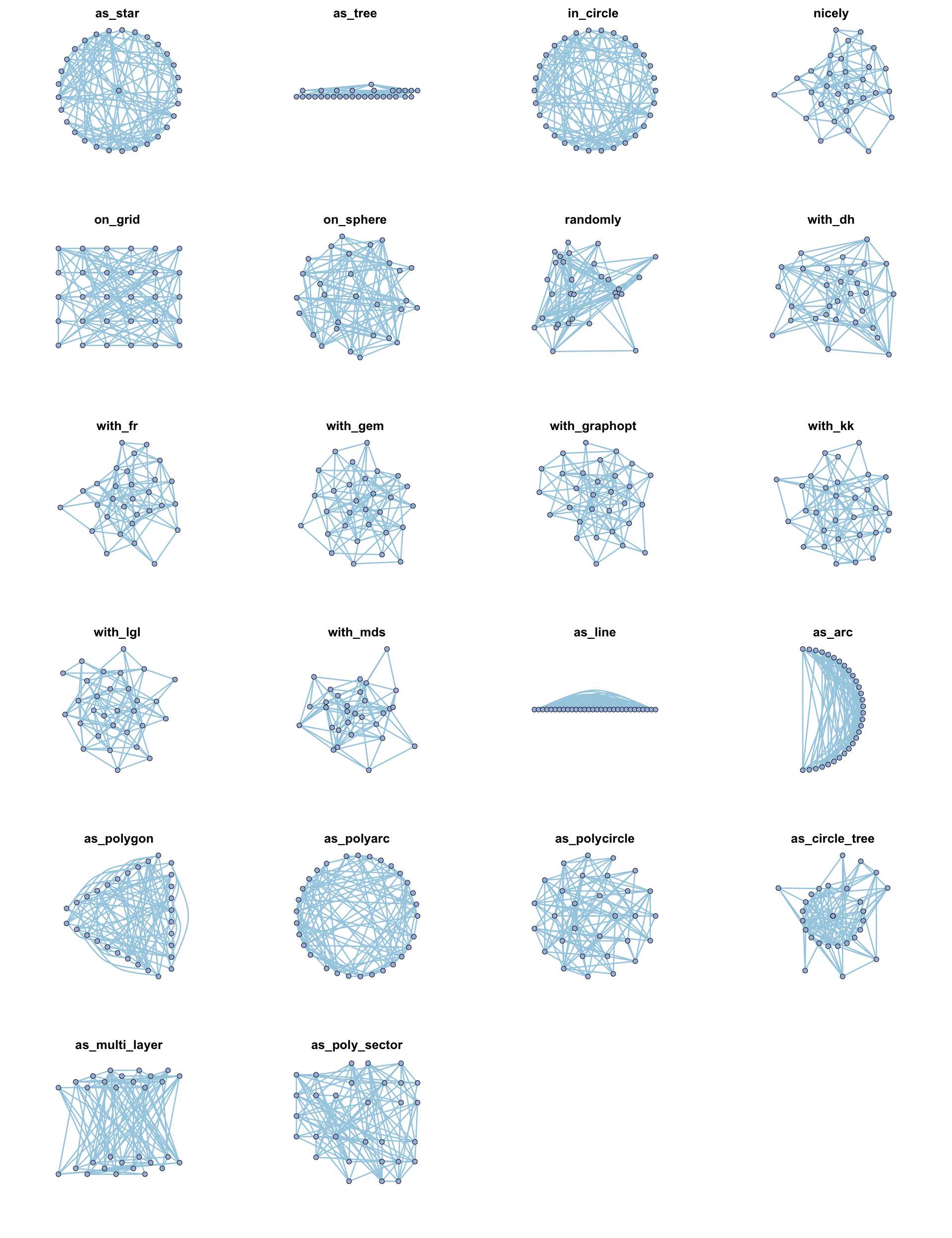 1. cooridnates dataframe, 2. layout function (e.g. as_star(), as_tree(), in_circle(), nicely()... see help(c_net_lay)) |
