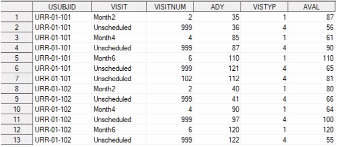 1. If two or more assessments are taken on the same date or same date and time , that is, if there is a scheduled visit,re-test visit(for lab data) and an unscheduled visit on the same date and time, then we choose scheduled visit first, then re-test visit and then unscheduled visit. That is one with smallest raw visit number. 2.For this we may create a variable called VISTYP and give for example values 1 to 3 to scheduled visit, re-test visit and unscheduled visit. Different rules can be applied for the selection of analysis visit with visit windowing. In most cases, the above codes can be applied. For the raw visits that do not fall under the visit window range we may either set it to blank or give “Not Windowed”.