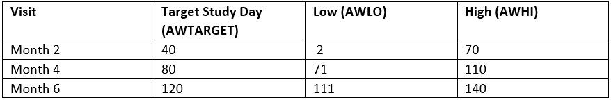 3. To find the closest visit we need to find the value for AWTDIFF, which is the difference between visit and target study day.