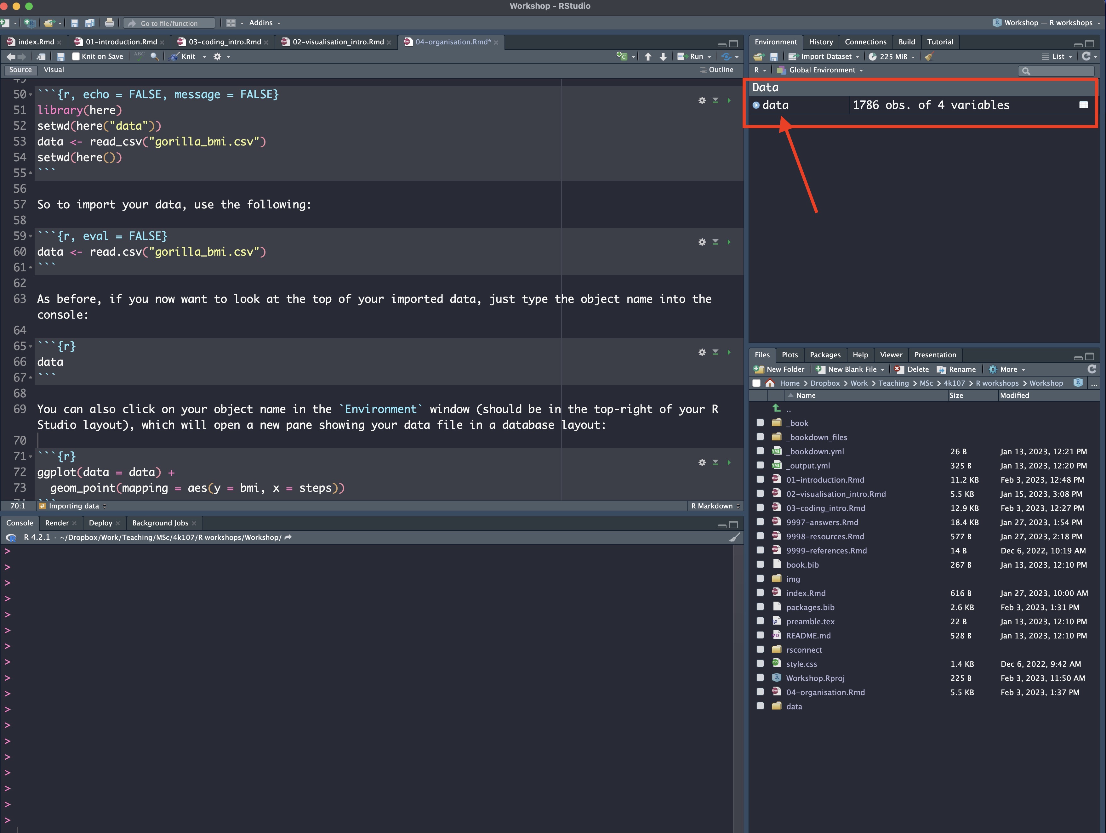 When importing data, it’s essential that you save the data to an object otherwise you won’t be able to access the data. For now, you can just call the object data if you want, but as you start to handle multiple data files in the same project you may want to come up with a more unique object name for each data set (for example, maybe gorilla_bmi_data).