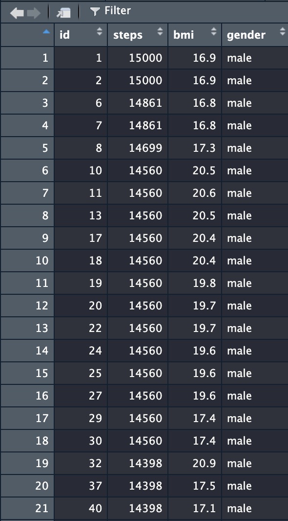 gorilla_bmi.csvdata from the OSF - Create a scatter plot showing steps on the x-axis and bmi on the y-axis