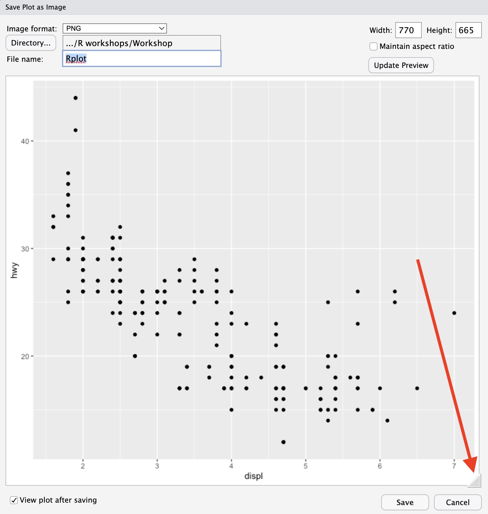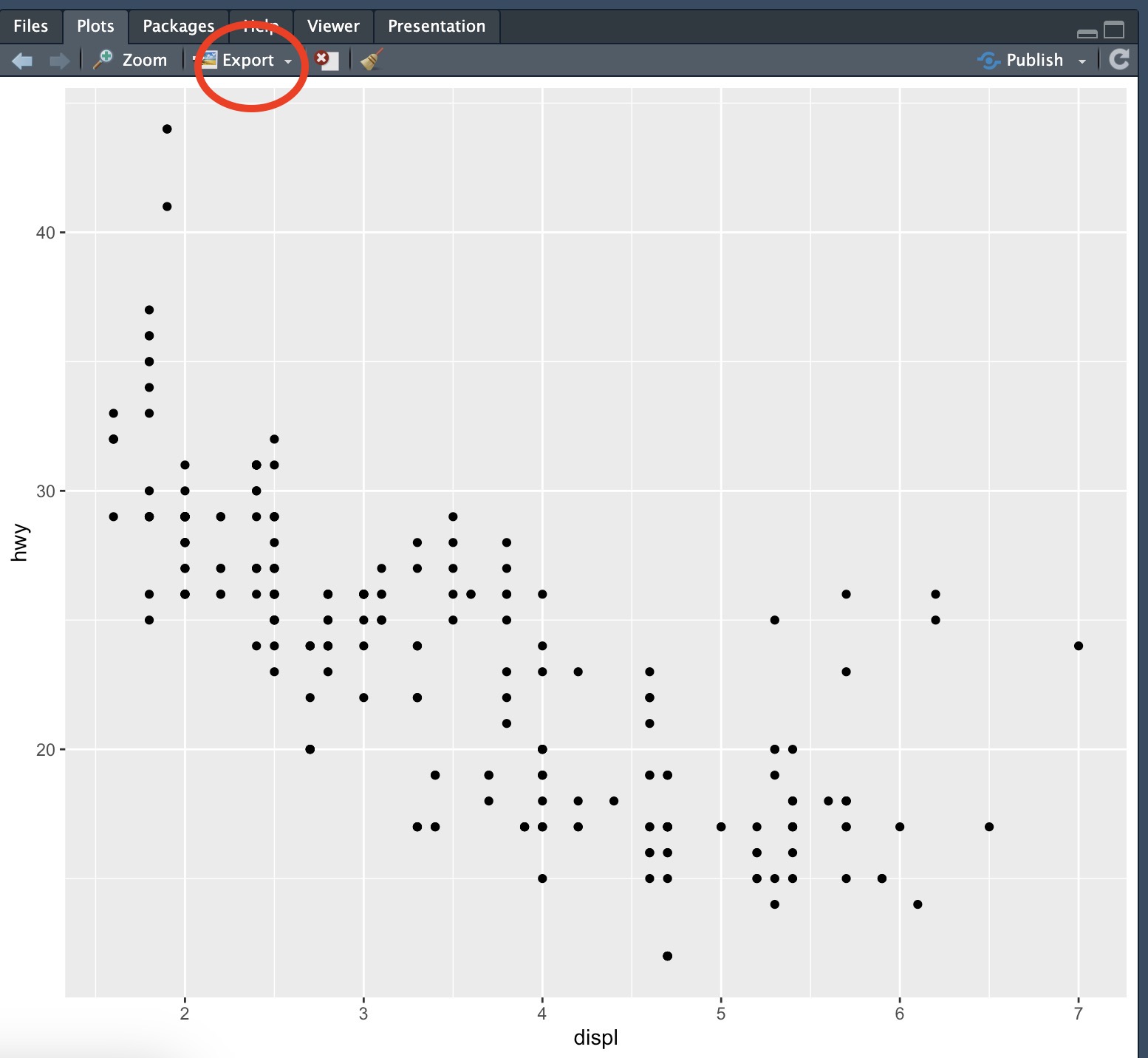 geom_point(mapping = aes(x = displ, y = hwy))In the window that shows your plot, click on the “Export” button (see Figure below:)