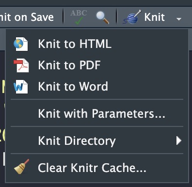 This is an html version of your R Markdown file! We can also create a PDF and a Word document of this file, which we will try now. Click on the little arrow next to the Knit button in the R Studio toolbar. When you do this, the following options menu should appear: