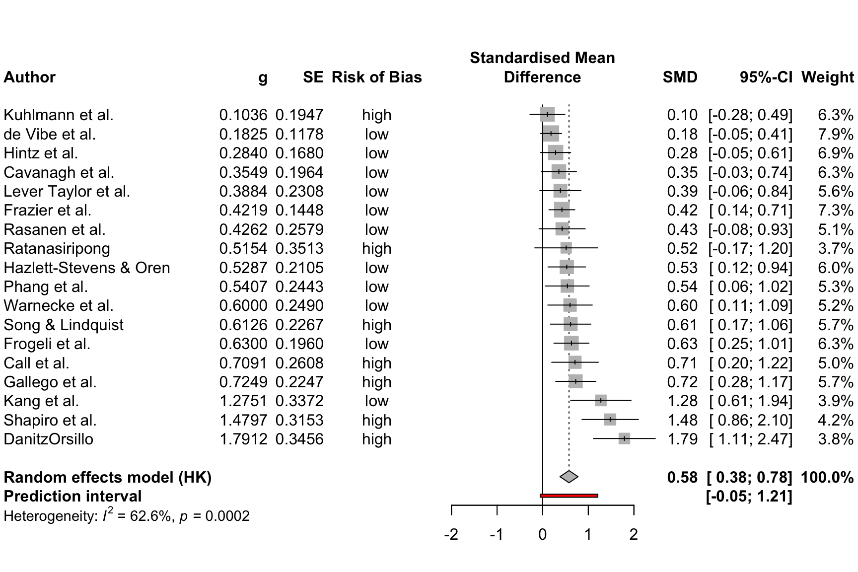 leftlabs = c("Author", "g", "SE", "Risk of Bias"))