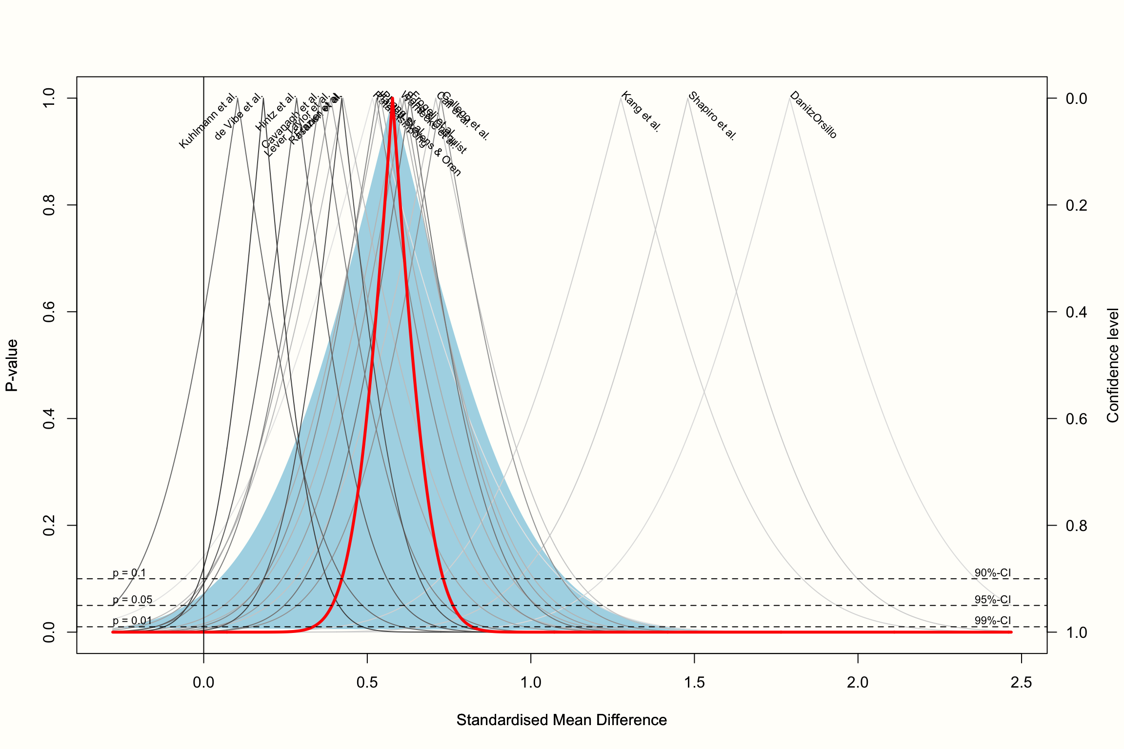 However, forest plots are not the only way to illustrate our results. Meta-analyses can also be visualized, for example, through drapery plots (RĂĽcker and Schwarzer 2021). A drawback of forest plots is that they can only display confidence intervals assuming a fixed significance threshold, conventionally \(p<\) 0.05. It is based on these confidence intervals that researchers decide if an effect is significant or not.
