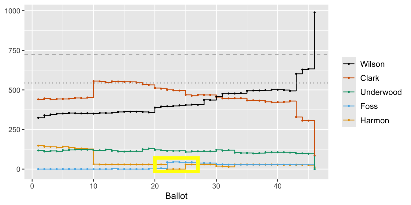 - The introduction of Foss on the 22nd ballot and the reintroduction of Harmon on the 25th ballot were attempts to find a compromise candidate. Neither gained ground.