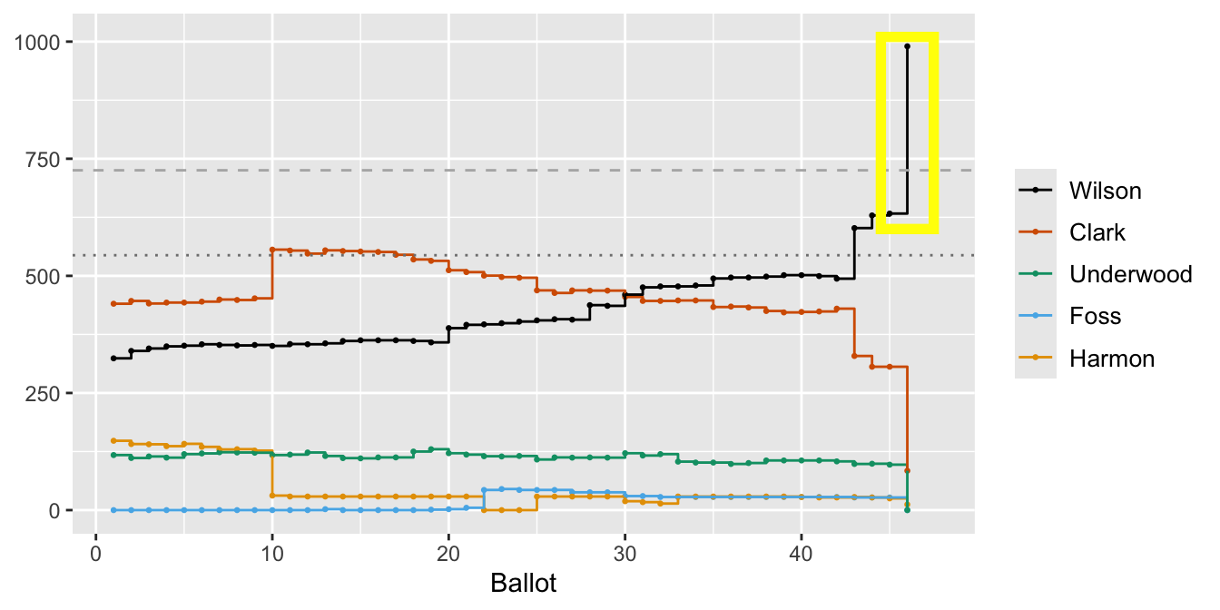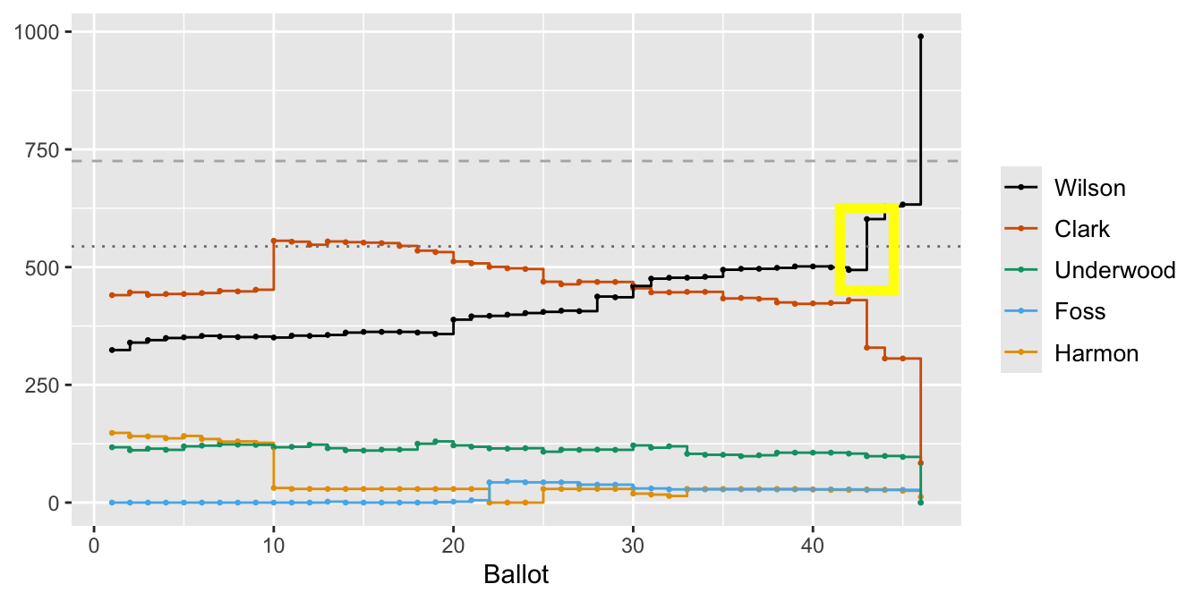 - Before the 46th ballot began, Underwood (with 97 delegates) withdrew without a recommendation to his supporters and it was clear that Wilson would win. Missouri, long-time supporters of Clark, insisted on a final ballot. Their spokesman said: “We are going to cast our vote for Clark on the last ballot. We have got to go back to Missouri.”