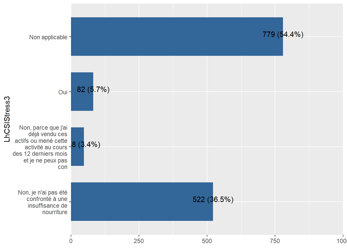 Chad_baseline_2018$LhCSIStress1 <- labelled::labelled(Chad_baseline_2018$LhCSIStress1, c(`Non, je n'ai pas été confronté à une insuffisance de nourriture` = 1, `Non, parce que j'ai déjà vendu ces actifs ` = 2, Oui= 3,`Non applicable`=4))