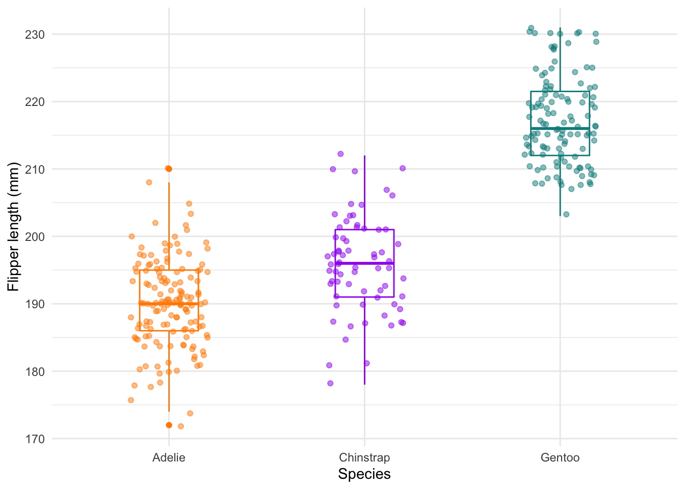 geom_jitter(aes(color = species), alpha = 0.5, show.legend = FALSE, position = position_jitter(width = 0.2, seed = 0)) +