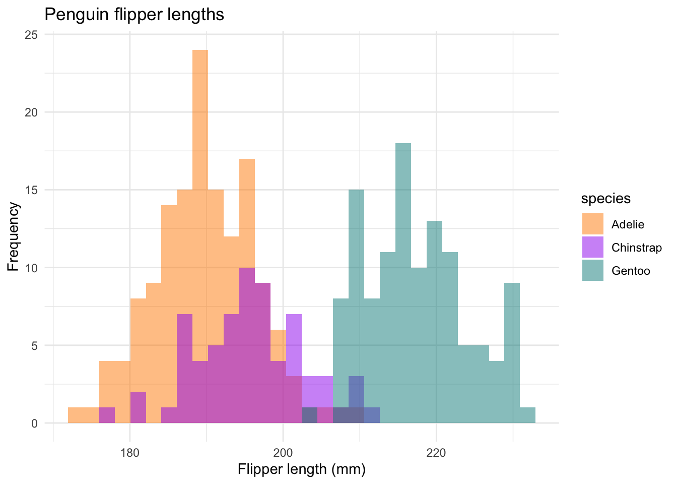 That is all flipper lengths across all species. Let’s add more layers. What about a separate distribution for each species, but plotted on the same graph? This means adding an aesthetic directly to geom_histogram. We can also add some labels.