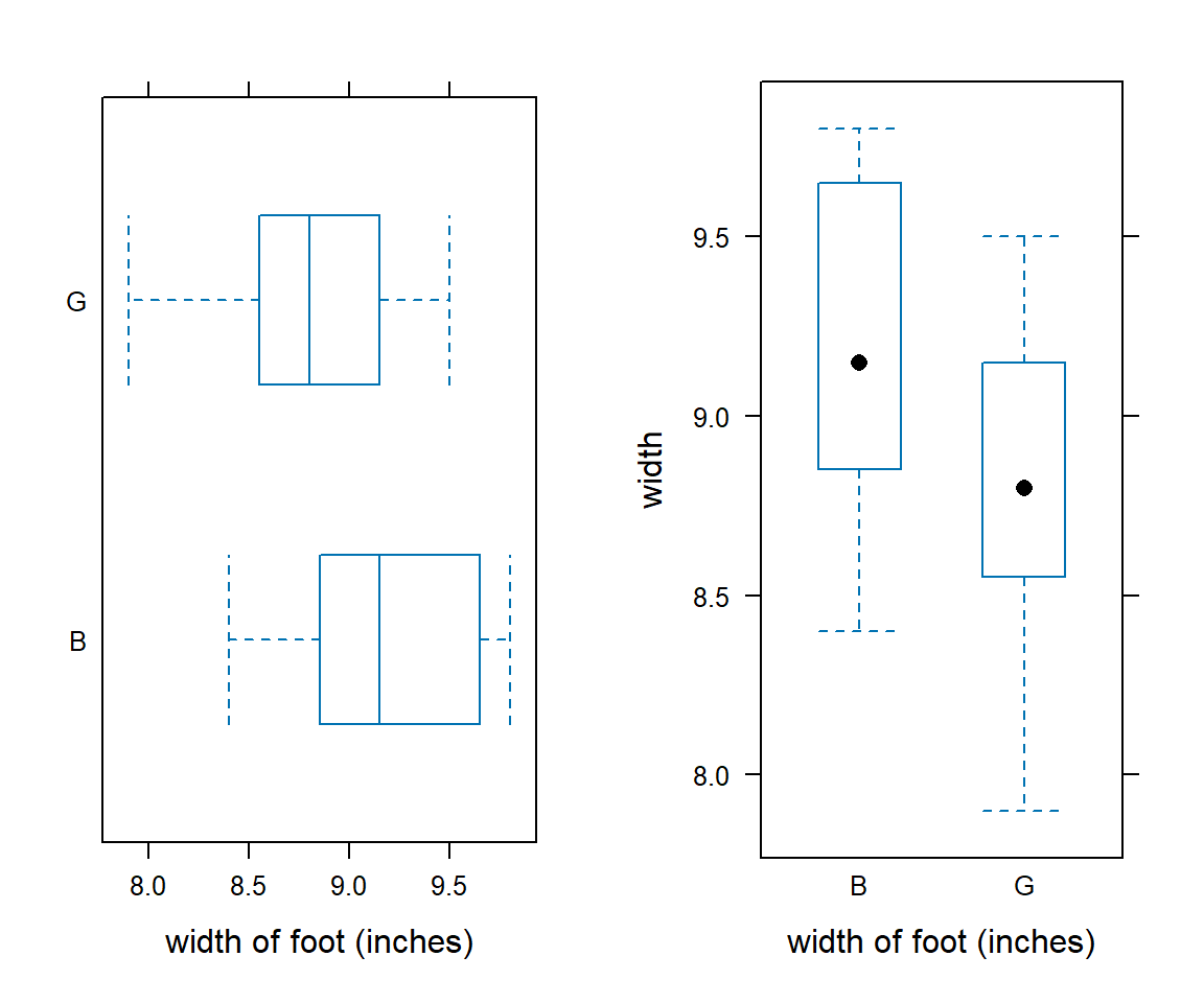 bwplot(width~sex , data=KidsFeet, xlab = "width of foot (inches)")