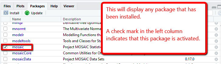 To learn more about a particular package, use the help (?) command. For example to find more information about the ‘mosaic’ package you could type ‘?mosaic’ in the Console window.