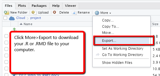 Use the More>Export button in the Files tab to downlad a script from RStudio Cloud.