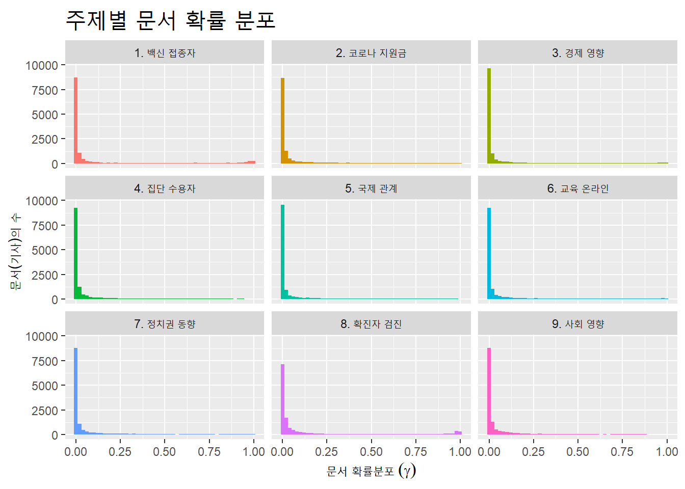 y = "문서당 주제 분포 비율",