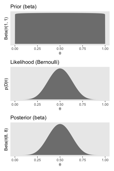 mutate(posterior = (likelihood * prior) / sum(likelihood * prior)) %>% # (i.e., p(theta | D))