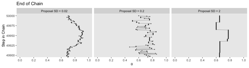 Kruschke wrote: “It is often the case in realistic applications that there is strong autocorrelation for some parameters, and therefore, an extremely long chain is required to achieve an adequate ESS or MCSE” (p. 187). As we’ll see, this is generally less of a problem for HMC than for MH or Gibbs. But it does still crop up, particularly in complicated models. As he wrote on the following page, “one sampling method that can be relatively efficient is Hamiltonian Monte Carlo.” Indeed.