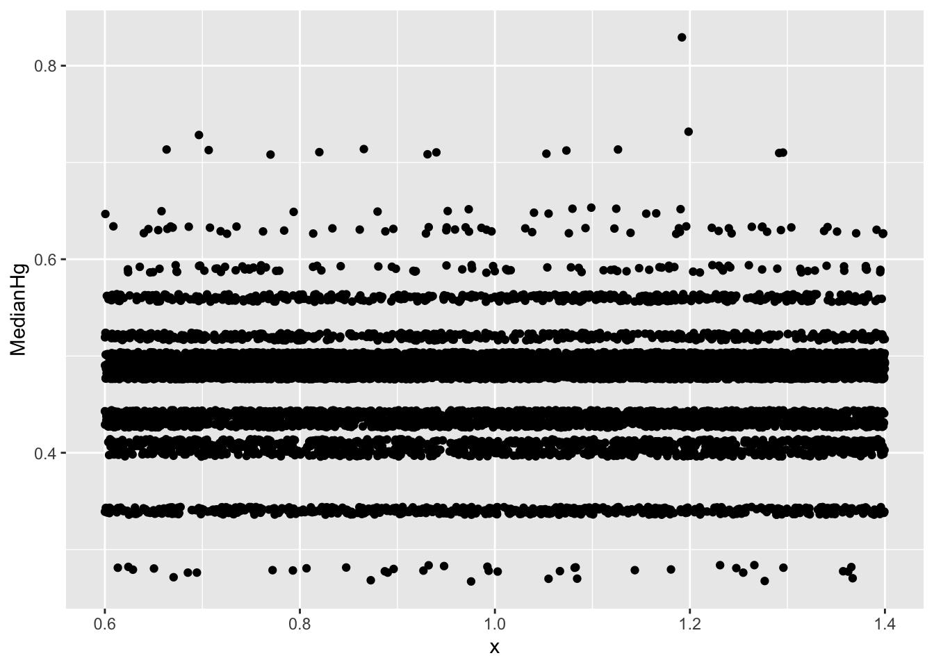 ggplot(data=Lakes_Bootstrap_Results, aes(y=MedianHg, x=1)) + geom_jitter()